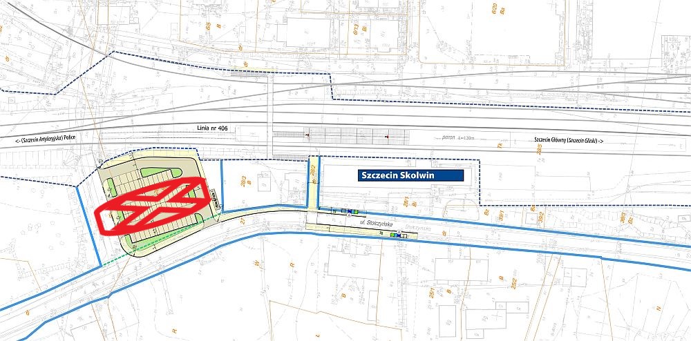 Jak widzimy na powyższej ilustracji (to jest screen z projektu przedstawionego na stronie SKM SZCZECIN) Na czerwono wykreślono część parkingu której próżno szukać w tym co powstało. Z planowanych 59 miejsc postojowych wybudowano 18! A gdzie reszta? Przesunięto przystanek (dalej niż jest na projekcie!) pomimo tego że w projekcie napisano “nie przewiduje się zmian lokalizacji przystanków”. Wykonano niepotrzebne dojście do kładki, której nie ma i zgodnie z informacjami dyrektora PKP PLK, ta kładka została zlikwidowana i nie powstanie.